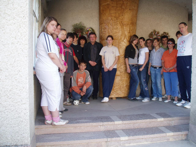 Csoportkép a Kölcsey Iskola bejáratánál.