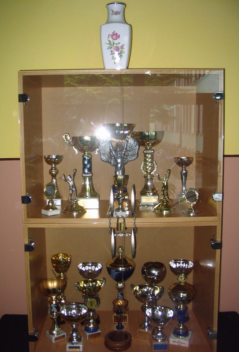 A kupák és emlékplakettek másik részlete.
