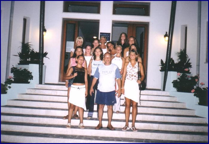 A csapat, a kísérőtanárok és a sofőr az apartman előtt.